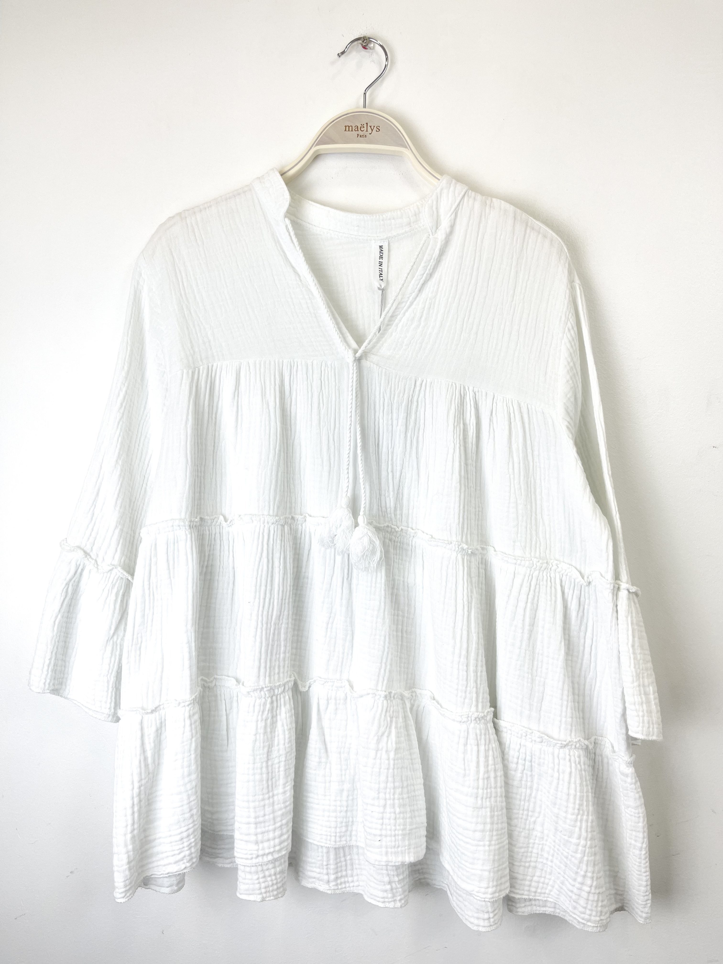 Katoenen blouse met volants – uitlopende mouwen – ronde hals – WIT kleur – Maat 38/40