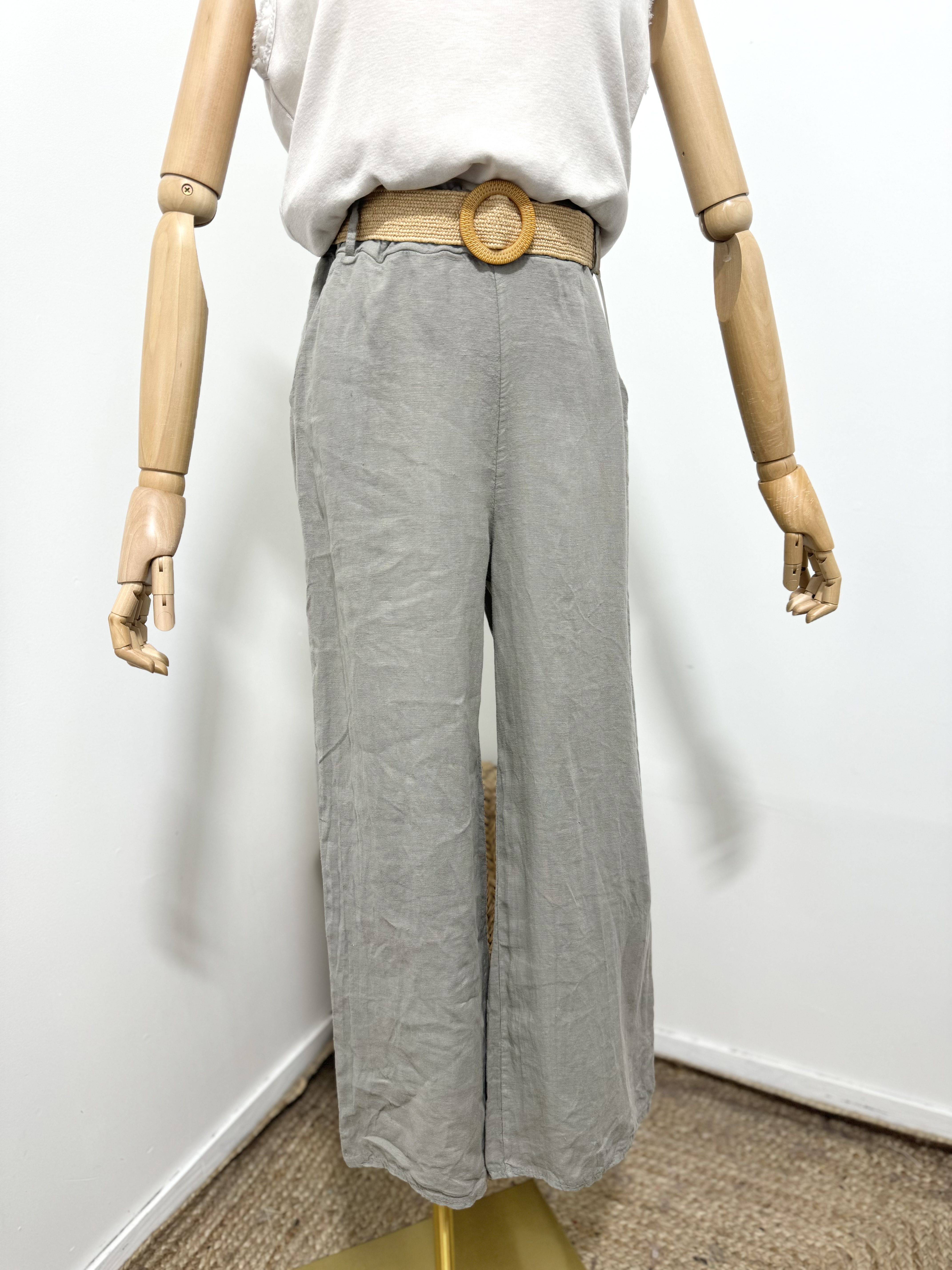 Linnen broek met een rieten ceintuur en zijzakken – elastische talie – kleur KAKI- maat 38/40