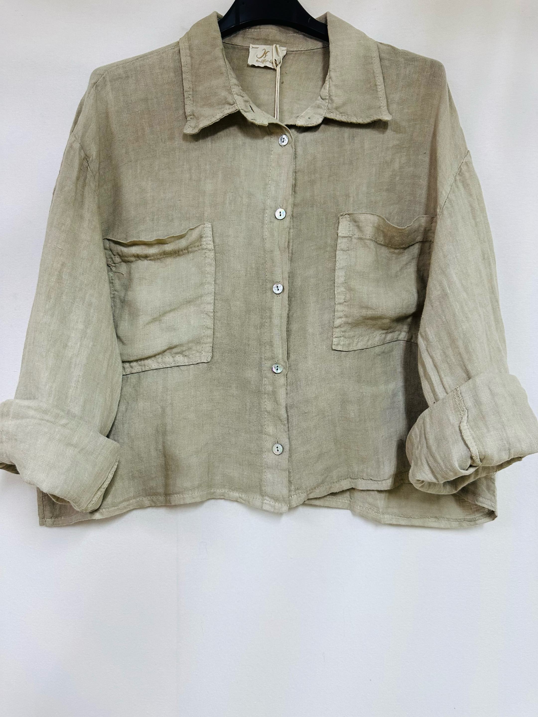 Linnen blouse me knoppen en voor zakken – oprollende mouwen – BABY ROSE kleur – Maat 42/44